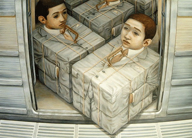 In both subject and stylistic execution, Ishida’s work is reminiscent of American artist George Tooker‘s paintings of the alienation and anxieties produced by urban bureaucracy.