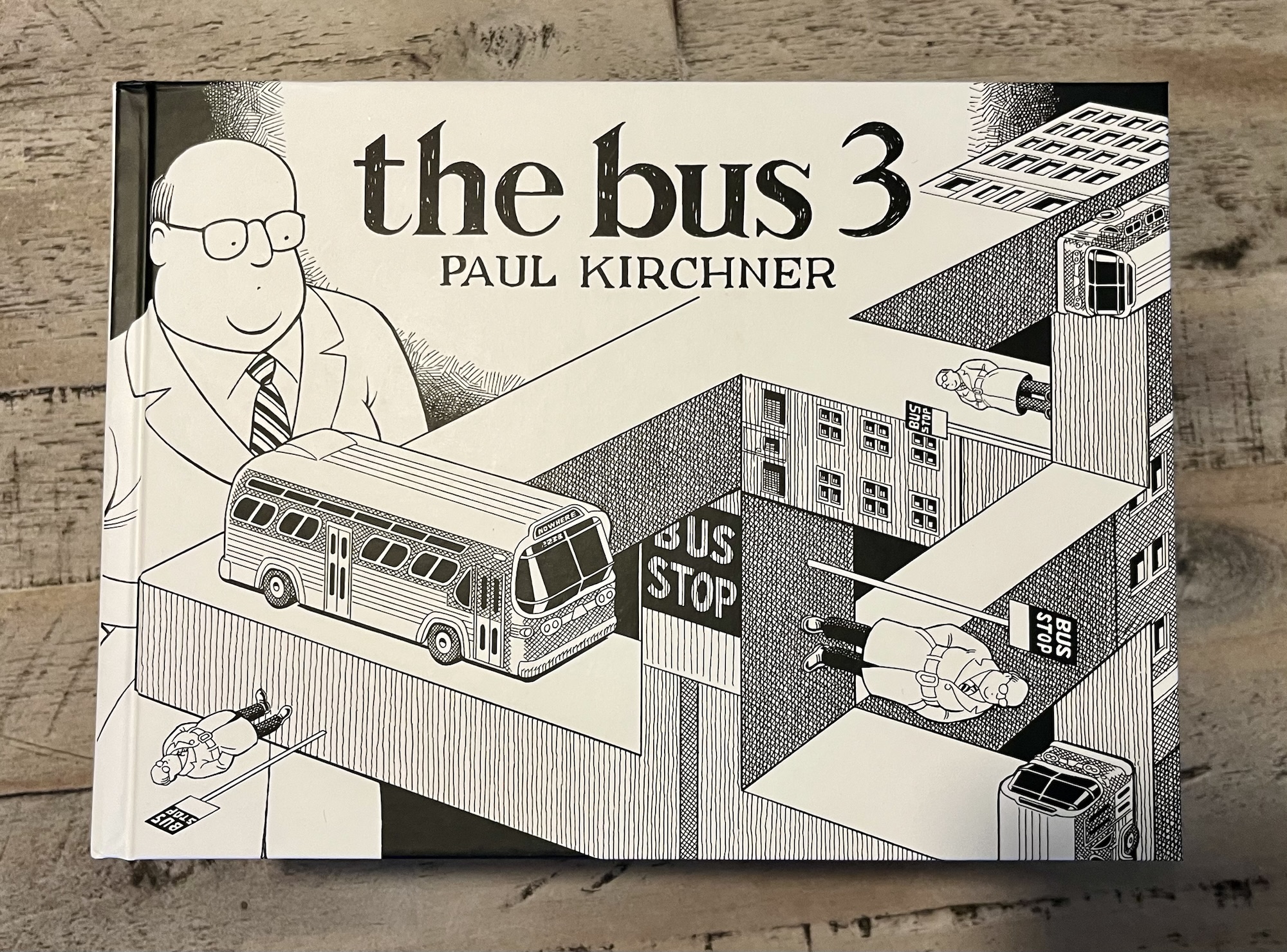 The Commuter’s foil and ferry is the titular bus (which Kirchner himself described as “demonic” in a 2015 essay in The Boston Globe); his Charon (and, really, partner) is the bus’s Driver. Each Bus strip is a double-decker one-pager rendered in precise black ink; most strips are wordless and consist of six or eight panels. Kirchner uses these constraints to conjure metaphysical gags that upend the banality of everyday existence. The previous two sentences that attempt to describe Kirchner’s formal techniques are a poor substitute for an example — so here is an example: