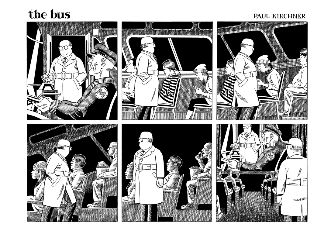 Paul Kirchner’s surreal comic strip The Bus is a looping, deadpan fugue of modern alienation and mechanical ritual, where a lone Commuter drifts through absurd, Escher-like permutations of transit life.