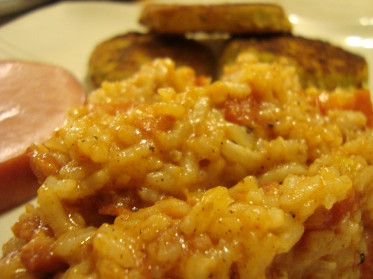 Fry squares of breakfast bacon and remove from the pan. Then brown some minced onion (one small one) in this grease, and add one pint can of tomatoes. When thoroughly hot, add a pint of rice to this mixture, and cook very slowly until the rice is done. Or, if you are in a hurry, cold rice may be substituted, and all warmed thoroughly together.