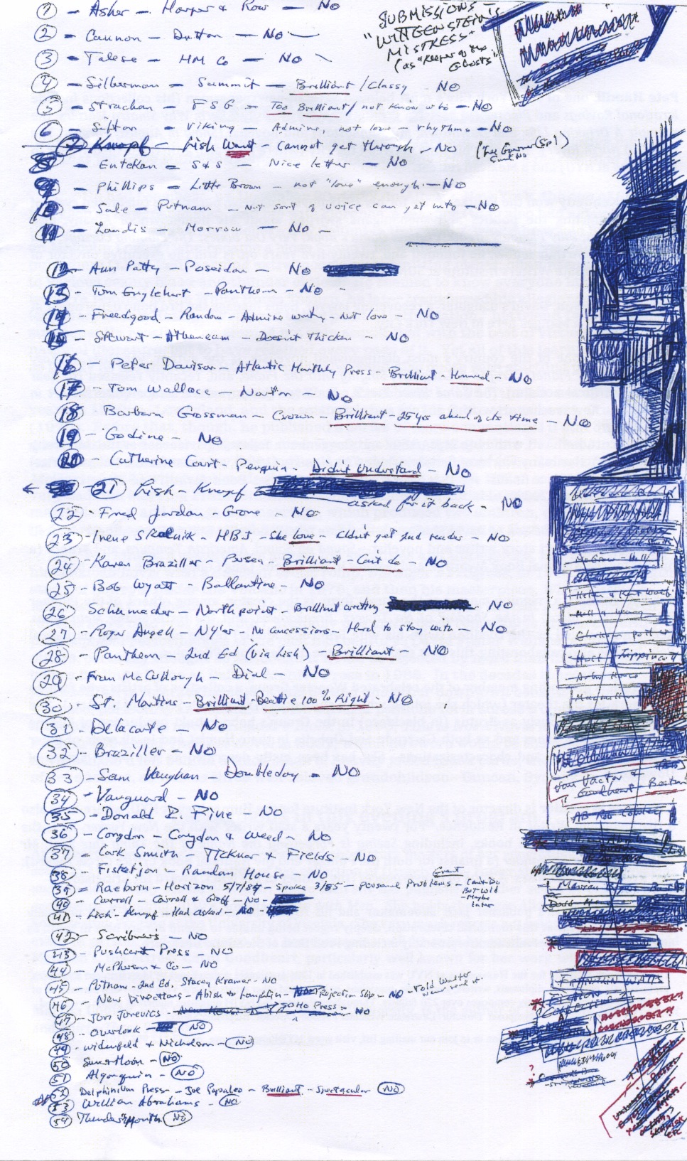 (The last page of David Markson’s copy of The Failure of Criticism by Henri Peyre (via) — see the list of rejections of Markson’s own Wittgenstein’s Mistress).